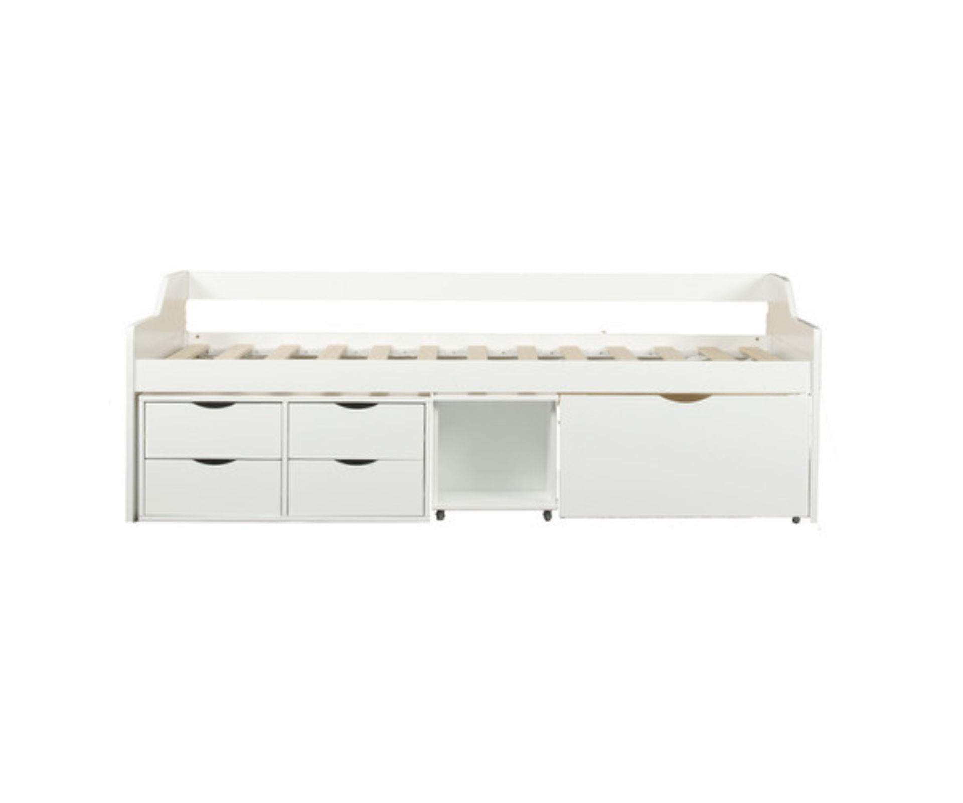 This single bed has a bit of everything, with under-bed storage in the form of four small drawers, a cubby hole, and one large drawer. Functioning as both a bed and a sofa, this flexible storage bed is a great addition to a kids’ bedroom, an office space, or a spare bedroom.