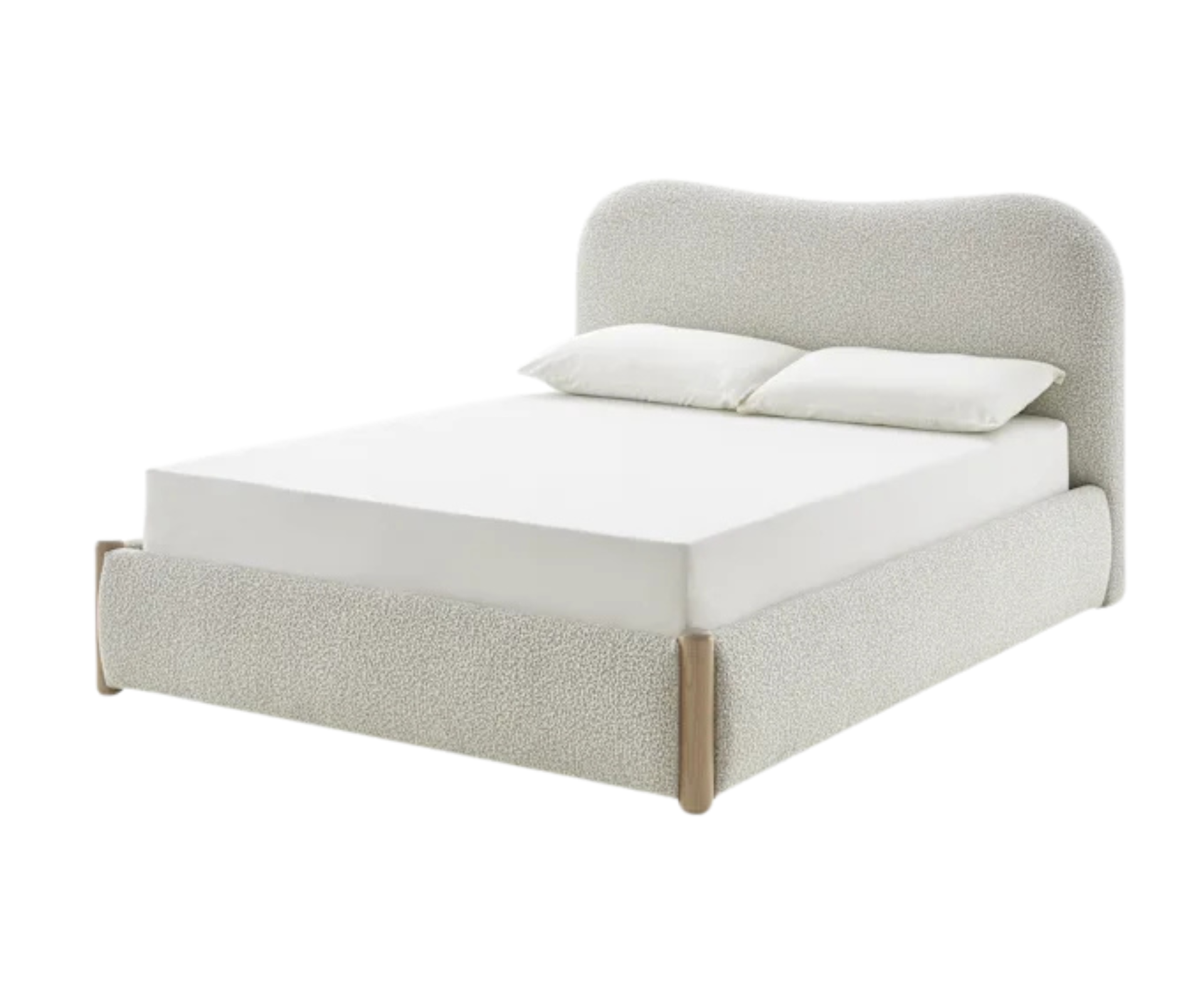 The Rochelle Storage Bed from Castlery boasts a charming curved headboard adorned with a delicate soft white performance bouclé fabric, complemented by elegant hardwood accents. Featuring a touch of subtle femininity, this bed brings both depth and gentle texture to your room.