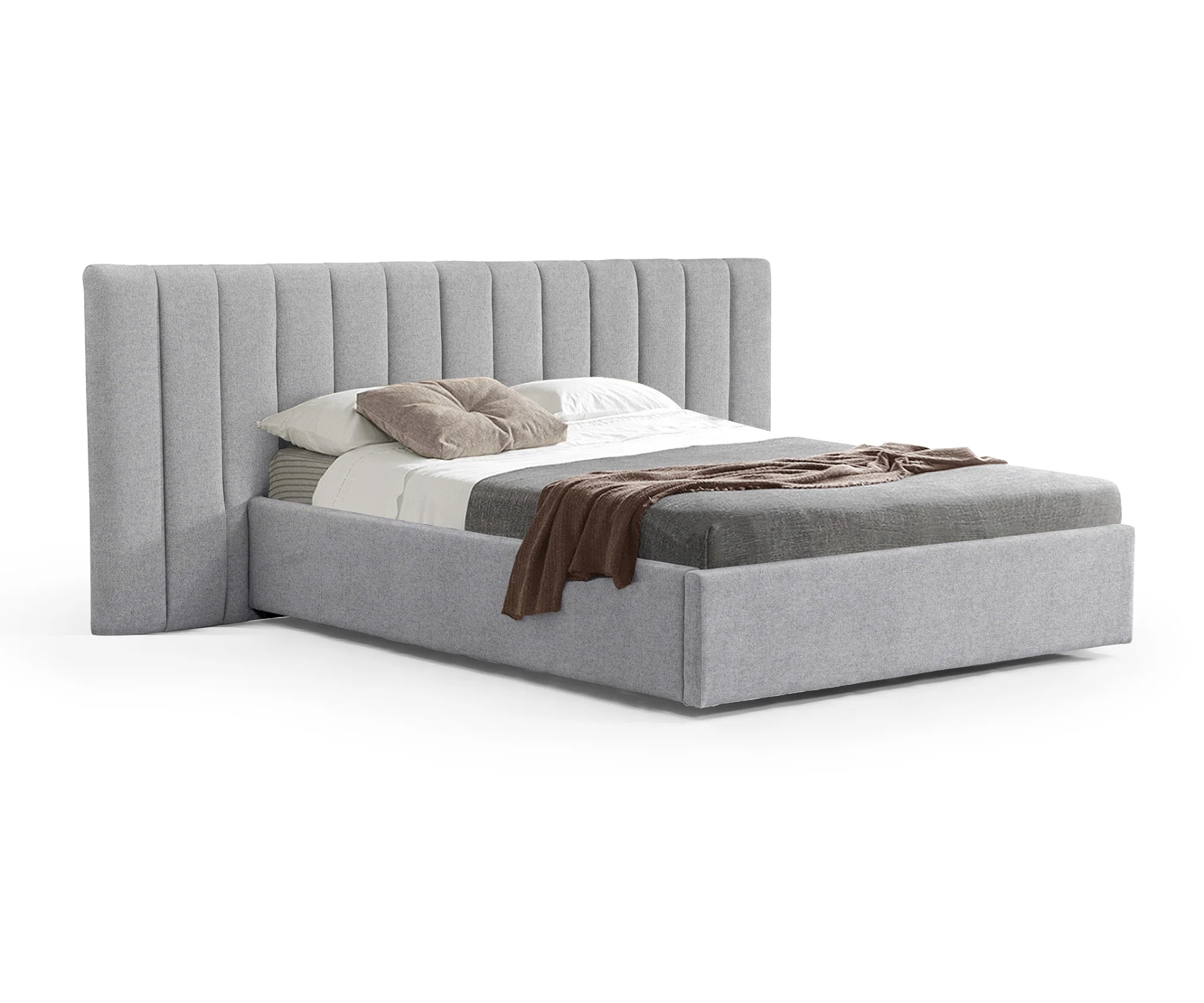 Upgrading your space from bedroom to master suite, this bed frame’s wide upholstered headboard elongates and elevates. Available in three textured variations of grey, the addition of under-bed storage makes this bed the ultimate one-and-done solution for any bedroom.