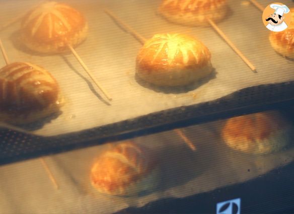 Coloca la mitad de los discos sobre una placa con papel sulfurizado. Pon un palo de brocheta encima de cada uno presionando levemente.