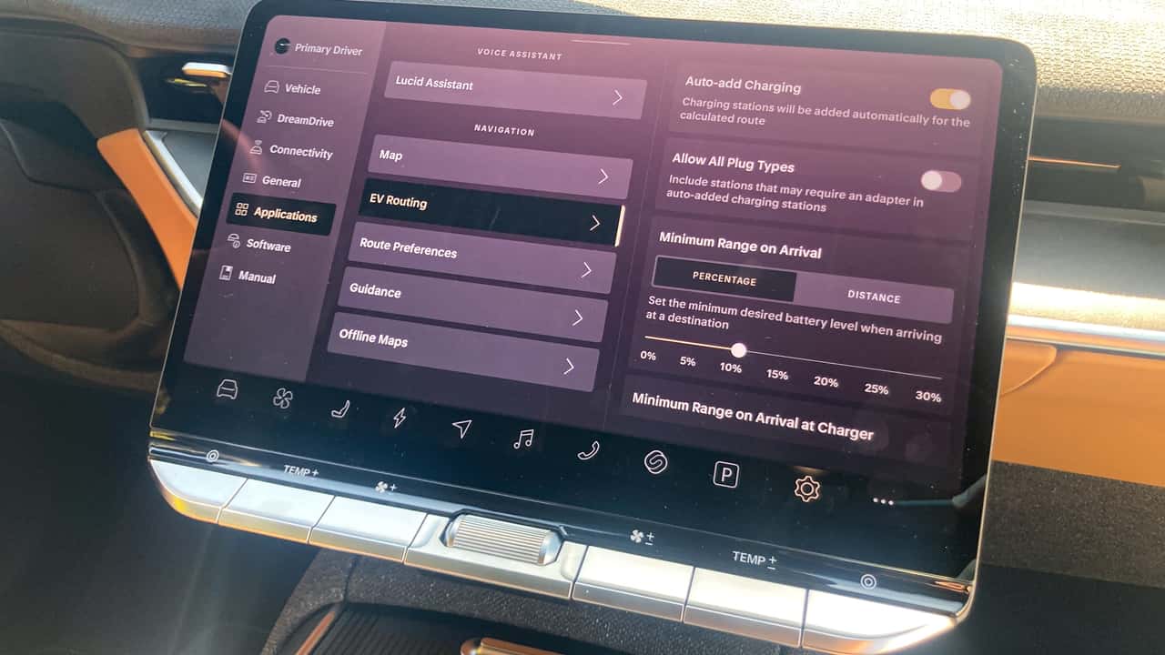 The route-planning system has been expanded with additional features such as choosing your desired battery level upon arrival and selecting favourite charging networks. The energy tab now shows efficiency advice tailored for novice electric vehicle drivers. Additionally, a significant improvement allows running two separate applications simultaneously across the Lucid’s dual screens; previously, this capability was notably absent from the Air model.